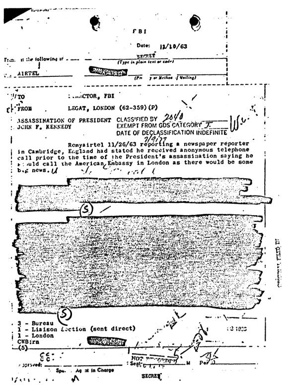 - DUE TO BACKGROUND MAN CHARGED WITH ASSASSINATION, [MI5?] REPORTED MORNING 23 NOV FOLLOWING DUE SOME SIMILAR PHONE CALLS OF STRANGELY COINCIDENTAL NATURE PERSONS RECEIVED IN THIS COUNTRY OVER PAST YEAR, PARTICULARLY IN CONNECTION WITH DR WARD CASE. [MI5?] REPORTED THAT AT 1805GMT 22 NOV AN ANONYMOUS CALL WAS MADE IN CAMBRIDGE, ENGLAND TO THE SENIOR REPORTER OF THE CAMBRIDGE NEWS RPT CAMBRIDGE NEWS. THE CALLER SAID ONLY THAT THE REPORTER SHOULD CALL THE AMERICAN EMBASSY IN LONDON FOR SOME BIG NEWS AND THEN RANG OFF. LAST NIGHT AFTER WORD OF THE PRESIDENT’S DEATH WAS RECEIVED THE REPORTER INFORMED THE CAMBRIDGE POLICE OF THE ABOVE CALL AND THE POLICE INFORMED [Special Branch or MI5]. IMPORTANT THING IS THAT CALL WAS MADE ACCORDING TO [British] CALCULATIONS ABOUT TWENTY FIVE MINUTES BEFORE PRESIDENT WAS SHOT. CAMBRIDGE REPORTER HAD NEVER RECEIVED CALL OF THIS KIND BEFORE AND [British] SAY HE IS KNOWN [?] TO THEM AS SOUND AND LOYAL PERSON WITH NO SECURITY RECORD. [British] WANTED ABOVE REPORTED PARTICULARLY IN VIEW REPORTED SOVIET BACKGROUND OSWALD. DEPENDING ON CIRCUMSTANCES, HQS MAY WISH PASS ABOVE TO [?] AS [British] COULD NOT REACH [FBI?] REP THIS MORNING. [British] STAND READY ASSIST IN ANY WAY POSSIBLE ON INVESTIGATIONS HERE.