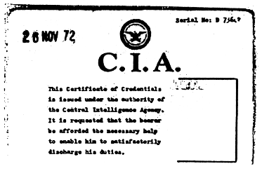 This Certificate of Credentials is issued under the authority of the Central Intelligence Agency. It is requested that the bearer be afforded the necessary help to enable him to satisfactorily discharge his duties.
