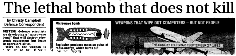 - The story ‘The lethal bomb that does not kill’ (Daily Telegraph 27 September 1992) proves that there is military interest in this country in microwaves. The story itself is a plant from the Ministry of Defence. Its purpose is unknown.